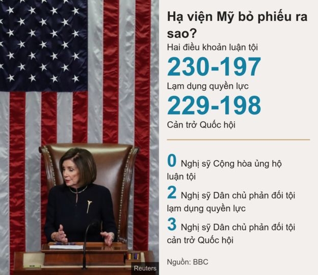 Tuy nhiên, đây mới là thủ tục đầu tiên mà thôi, chứ ông Tổng thống Trump chưa bị kết án hai tội mà Hạ viên đã cáo buộc là lạm dụng quyền lực và cản trở công việc hành pháp và lập pháp của Hạ viện. Vì thế, tôi nghĩ rằng kết quả chưa hẳn là có bất lợi về mặt chính trị cho ông Trump hay không, vì như ai cũng biết, để kết tội ông Trump thì tại Thượng viện cần có 2/3 số phiếu thuận, và đảng Dân chủ không có đủ 67 thượng nghị sĩ để kết tội.
