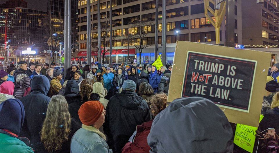 Nhiều người cầm biểu ngữ có dòng chữ "Impeach & Remove Trump Now", "Nobody Is Above the Law", "Trump is a Danger to Democracy", "Trump is a Liar in Chief", "Trump is Putin's Puppet", "Instead of Right vs. Left, Think Right vs. Wrong" (Thay vì nghĩ tới cánh hữu vs cánh tả, hãy nghĩ tới đúng vs sai)...