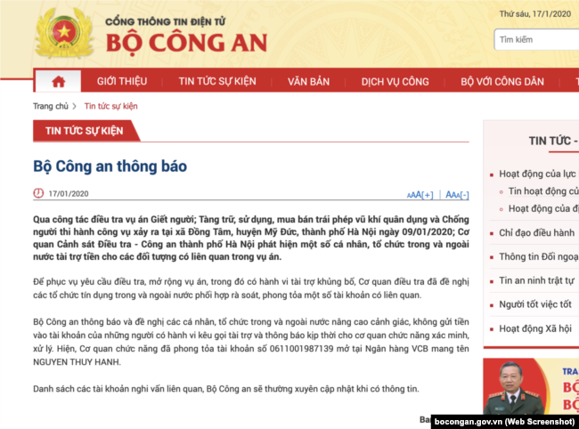 Thông báo của Bộ Công an về việc phong tỏa tài khoan "Nguyen Thuy Hanh".
