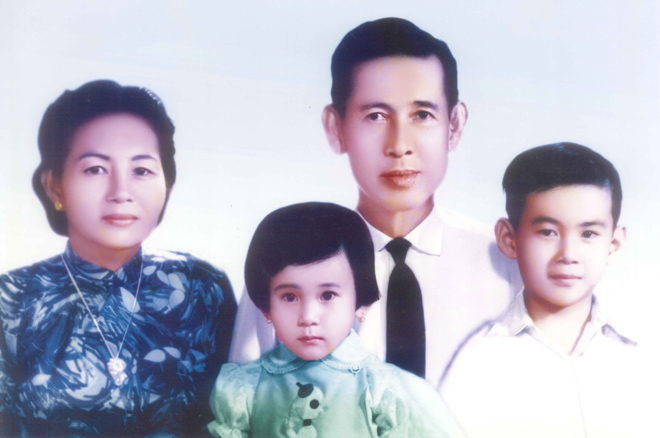 Đoan Trường ngày nhỏ trong bức ảnh chụp cùng gia đình với bố mẹ và em gái