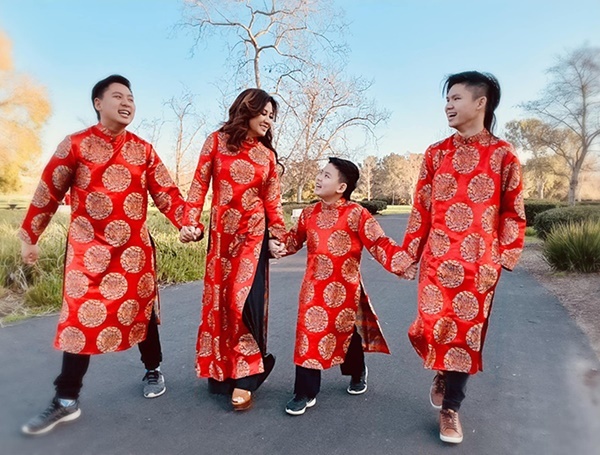 Trizzie Phương Trình - vợ cũ của Bằng Kiều, cùng 3 con trai mặc áo dài truyền thống mang đậm không khí Tết. Ba con trai của Bằng Kiều còn quay video chúc Tết người thân trong gia đình.