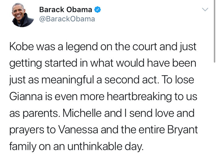 Barack Obama chia sẻ: “Kobe là một huyền thoại trên sân bóng rổ và chỉ mới bắt đầu thực hiện sự nghiệp thứ hai của mình. Mất Gianna thậm chí còn đau lòng hơn với chúng tôi là cha mẹ. Michelle và tôi gửi lời yêu thương và cầu nguyện đến Vanessa và toàn thể gia đình Bryant vào một ngày không tưởng.” Kylie Jenner chia sẻ: “Không biết nói gì lúc này, chỉ biết cầu nguyện cho gia đình xinh đẹp này.”