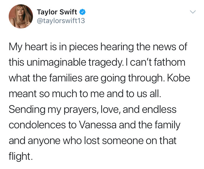 Taylor Swift: “Trái tim tôi tan vỡ khi nghe tin tức về thảm kịch không thể tưởng tượng được này. Tôi không thể hiểu được những gì gia đình họ đang trải qua. Kobe có ý nghĩa rất lớn đối với tôi và tất cả chúng ta. Gửi lời cầu nguyện, tình yêu và lời chia buồn bất tận của tôi đến Vanessa và gia đình cùng bất cứ ai ra đi trên chuyến bay đó.”