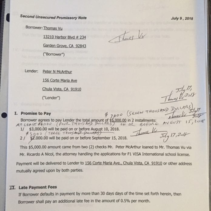 Ông kể: “Hắn xoay đủ kiểu, lợi dụng ḷng tin của tôi. Lúc th́ năn nỉ tôi cho mượn tiền trả cho IRS, rồi mở trường ‘international school’ dạy cho người mới tới hoặc ở Việt Nam ở một địa điểm gần đây (khác với cái sẽ mở ở San Jose.)”