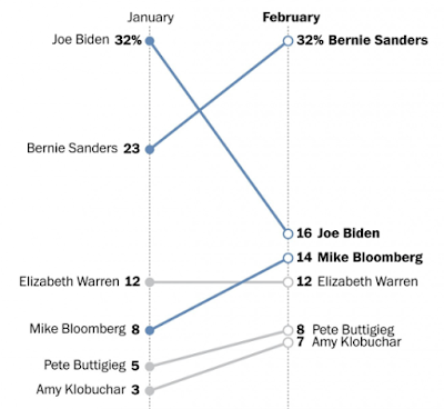 Thăm dò mới nhất của báo Washington Post đã cho thấy một biến chuyển động trời ngay trong một tháng đầu sau khi cuộc chạy đua thật sự bắt đầu với hai cuộc bầu sơ bộ tại Iowa và New Hampshire. Cụ Biden mất một nửa hậu thuẫn, từ 32% rớt xuống còn có 16%, trong khi cụ Sanders vọt lên từ 23% tới 32%. Lạ hơn nữa, tỷ phú Bloomberg nhờ tung ra hơn 300 triệu mua quảng cáo trên TV, báo, trang mạng và emails đã thấy hậu thuẫn của mình nhẩy từ 8% lên tới 14%, lên tới hàng thứ ba, đẩy cụ bà Warren xuống hạng tư.