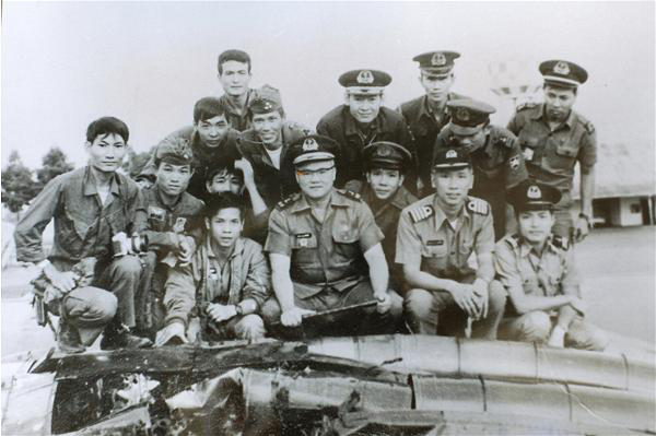 H̀NH ẢNH: ảnh kỷ niệm “Chuyến Bay Rùng Rợn Tết 1974”, trên chiếc phi cơ C-7A tử thần, toàn bộ phái đoàn Hải Quân và phi hành đoàn đứng trên cánh máy bay, bên cạnh cái máy phải bị phá hủy. Tư lệnh Hải Quân Đề Đốc Trần Văn Chơn, ngồi giữa hàng đầu, Đại tá Quỳnh bên cạnh với phái đoàn của Hải quân bên phải. Đại úy Kim (3 mai vàng trên ca lô, đứng khom lưng, sau tướng Chơn) Thiếu úy Tấn, (một mai vàng trên ca lô) Cơ phi Tr/s Dũng ngồi cạnh Đề Đốc Trần Văn Chơn, với phi hành đoàn của Đại úy Kim và một số nhân viên kỹ thuật bên trái. (cựu đại úy Kim sống ở bắc Calif, Th/u Tấn Houston và Tr/s Dũng Seattle). Ống khói nơi nối liền với động cơ đă bị nổ với một lỗ hỏng lớn trên lưng của động cơ phải.