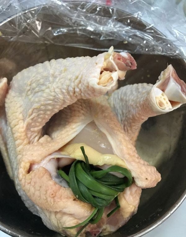 - Lấy gà đã ướp ra, tiếp tục thấm khô gà bằng giấy ăn. Thắt nút hành lá, thêm gừng nhồi vào bụng gà.