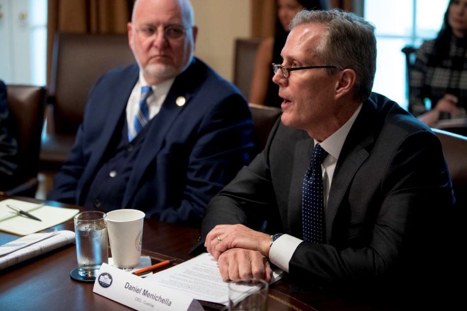 Giám đốc CureVac Daniel Menichella, phải, ngồi cạnh ông Robert Redfield, giám đốc CDC trong cuộc họp tại Tòa Bạch Ốc. (Hình: AP Photo/Andrew Harnik)