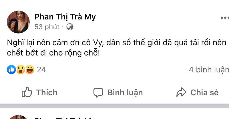 Và lần gần đây nhất nữ diễn viên Trà My đã có những phát ngôn gây sốc khi cô cảm ơn đại dịch Covid-19: “Nghĩ lại nên cảm ơn cô Vy, dân số thế giới đã quá tải rồi nên chết bớt đi cho rộng chỗ” đã khiến dư luận phẫn nộ lên tiếng chửi bới nữ diễn viên. Bên cạnh đó, cũng có nhiều nghệ sĩ lên tiếng bày tỏ sự thất vọng khi có một đồng nghiệp như thế.