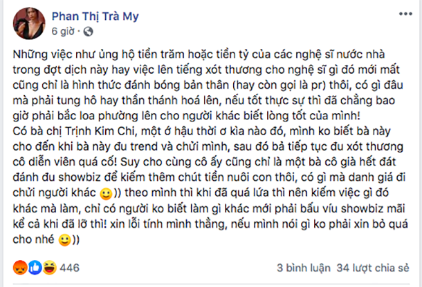 “Những việc như ủng hộ tiền trăm hoặc tiền tỷ của các nghệ sĩ nước nhà trong đợt 𝖉ị𝖈𝖍 này hay việc lên tiếng xót thương cho nghệ sĩ gì đó mới mất cũng chỉ là hình thức đánh bóng bản thân (hay còn gọi là pr) thôi, có gì đâu mà phải tung hô hay thần thánh hóa lên, nếu tốt thực sự thì đã chẳng bao giờ phải bắc loa phường lên cho người khác biết lòng tốt của mình!”, Nguyên văn nữ diễn viên Trà Mi chia sẻ.
