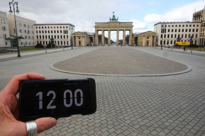 Khuôn viên bên ngoài cổng Brandenburg, thủ đô Berlin, Đức trống vắng người. Cổng Brandenburg có chiều cao 26m, rộng 65,5m, được xây dựng bằng đá sa thạch, là công trình biểu tượng và địa điểm không thể bỏ qua khi đến Đức. Ảnh: Hannibal Hanschke/Reuters.