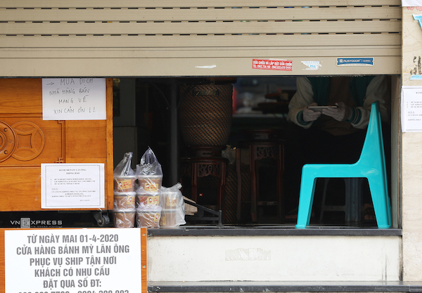 Cửa hàng kinh doanh đồ ăn trên phố cổ Hà Nội hạ cửa một nửa, hàng hoá được chuẩn bị sẵn để phục vụ nhanh cho khách mang về.