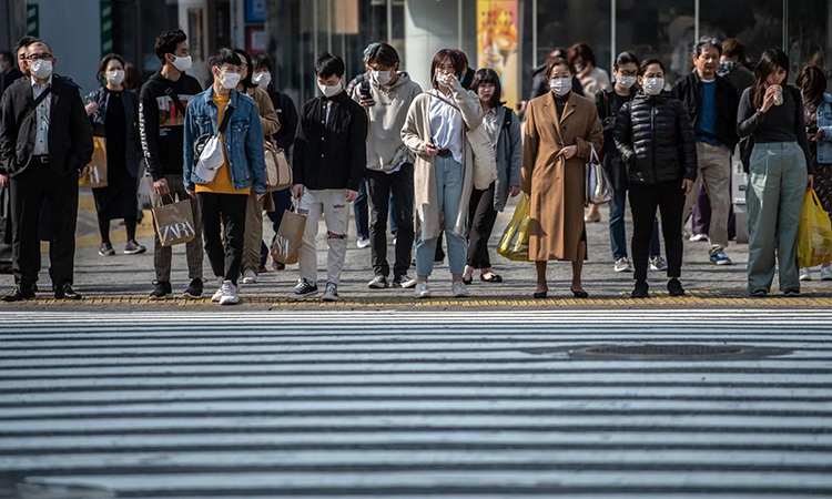 Người dân Nhật Bản đeo khẩu trang đứng chờ qua đường ở Tokyo đầu tháng 4. Ảnh: AFP.