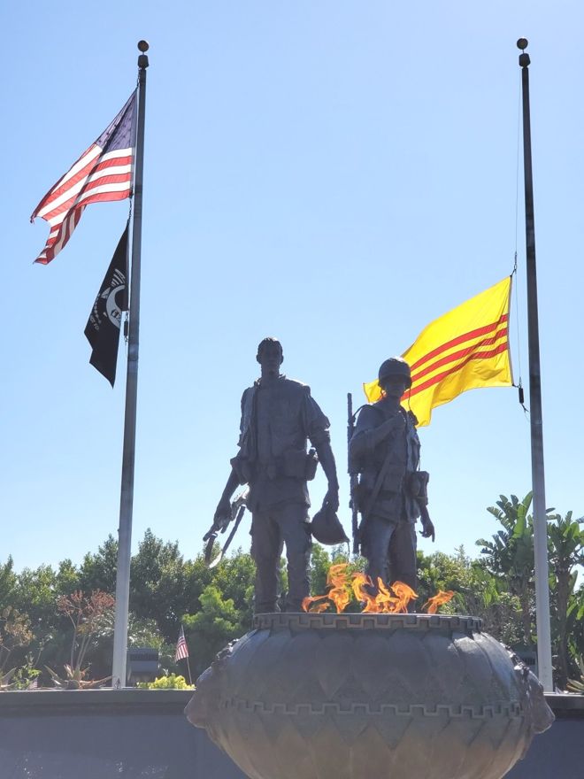 Tượng Đài Chiến Sĩ Việt-Mỹ trong công viên Sid Goldstein Freedom Park vắng lặng trong ngày Thứ Bảy, 25/4/2020. Lá cờ vàng ba sọc đỏ đã được hạ xuống lưng chừng trong ý nghĩa tưởng niệm