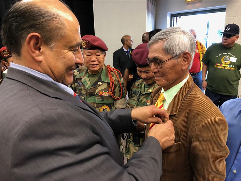 Dân Biểu Lou Correa (trái) gắn huy hiệu vinh danh cựu quân nhân VNCH. (Hình: Linh Nguyễn)