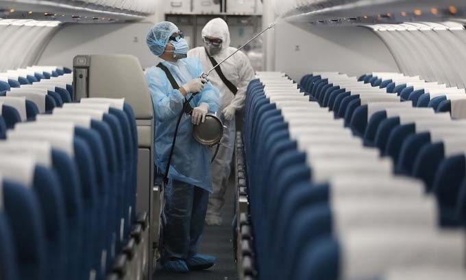 Nhân viên y tế phun thuốc khử trùng trên một chuyến bay của Việt Nam ngày 13/3. Ảnh: Ngọc Thành.