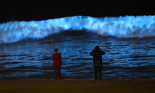 Người dân ngắm nhìn sóng biển phát quang ở Los Angeles, Mỹ. Ảnh: AP.