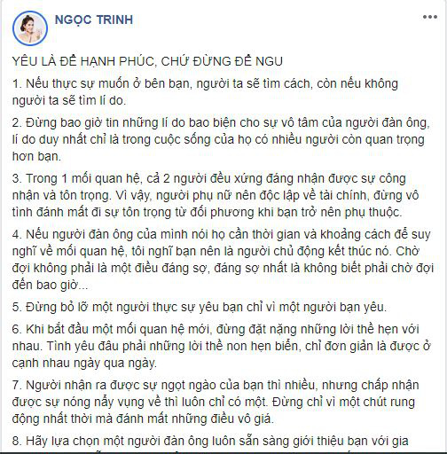 Ngọc Trinh nói thêm: "Đừng bỏ lỡ một người thực sự yêu bạn chỉ vì một người bạn yêu", "Dù yêu ai thì suy cho cùng cũng là để hạnh phúc. Vậy tại sao cứ phải níu giữ một người không đem lại hạnh phúc cho mình? Phải không những người phụ nữ thông minh, tinh tế, bản lĩnh?".