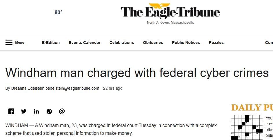 Tin của nhật báo Eagle Tribune cho biết người bị cáo buộc là Jonathan Nguyễn, sống tại thị xã Windham. Anh này bị truy tố các tội gồm gian lận và ăn cắp căn cức qua điện tử.