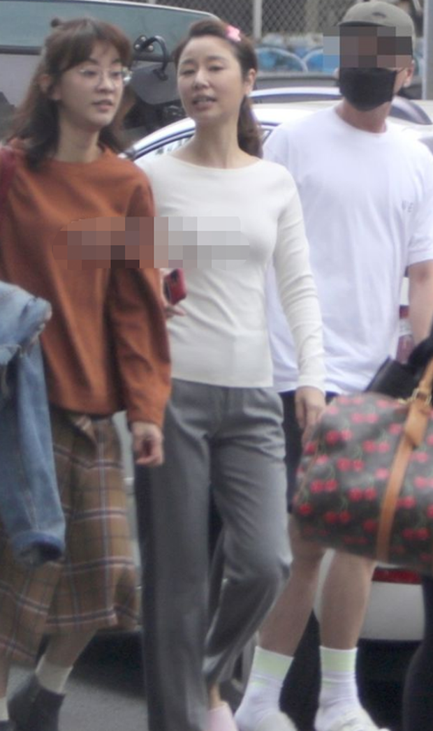 Trong loạt ảnh được chụp lén, người đẹp 44 tuổi diện trang phục đơn giản, mang dép, để mặt mộc, tóc cột đơn giản xuất hiện trên phim trường.