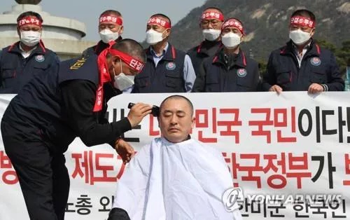 Một thành viên USFK cạo đầu trong cuộc biểu tình phản đối nghỉ việc không lương hồi tháng 3. Ảnh: Yonhap