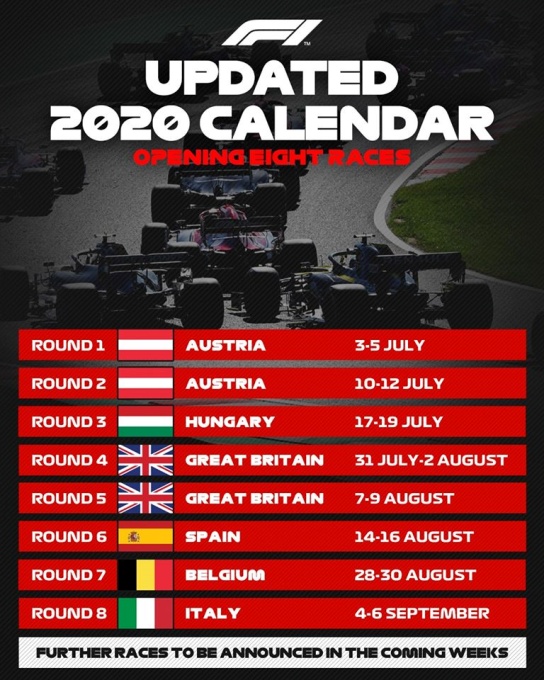 Theo đó, Áo sẽ là địa điểm tổ chức hai chặng đua đầu tiên, diễn ra lần lượt vào hai ngày 5 và 12-7, tại trường đua Red Bull Ring, Spielberg. Đây là lần đầu tiên một trường đua được tổ chức hai vòng trong cùng một mùa, lần đầu tiên một mùa giải được bắt đầu ở Áo, và cũng là lần đầu tiên một cuộc đua F1 được tổ chức không có khán giả.
