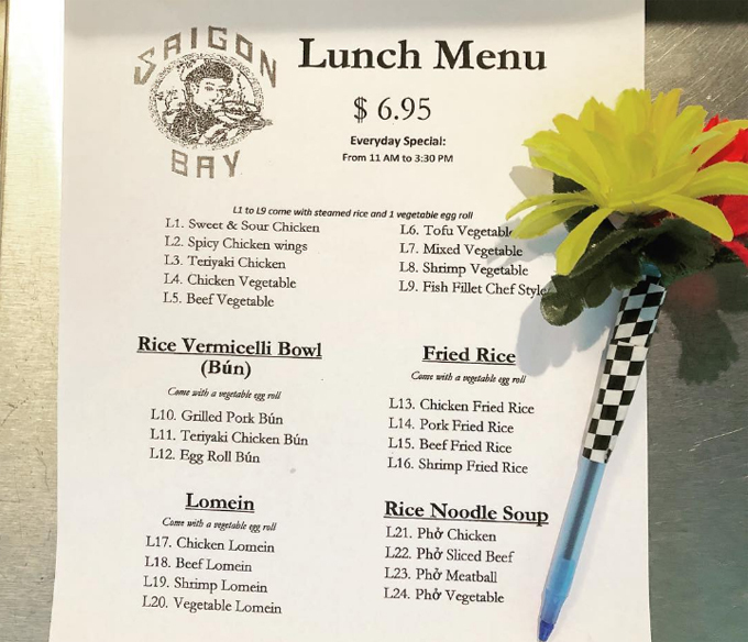 Saigon Bay phục vụ bữa trưa đồng giá 6,95 USD (khoảng 160.000 đồng) cho 24 lựa chọn, bao gồm bún, cơm rang, phở và cơm đĩa (với các lựa chọn như thịt bò, thịt gà, đậu phụ, tôm, thịt nướng, gà chua ngọt)... theo khẩu vị Việt Nam.