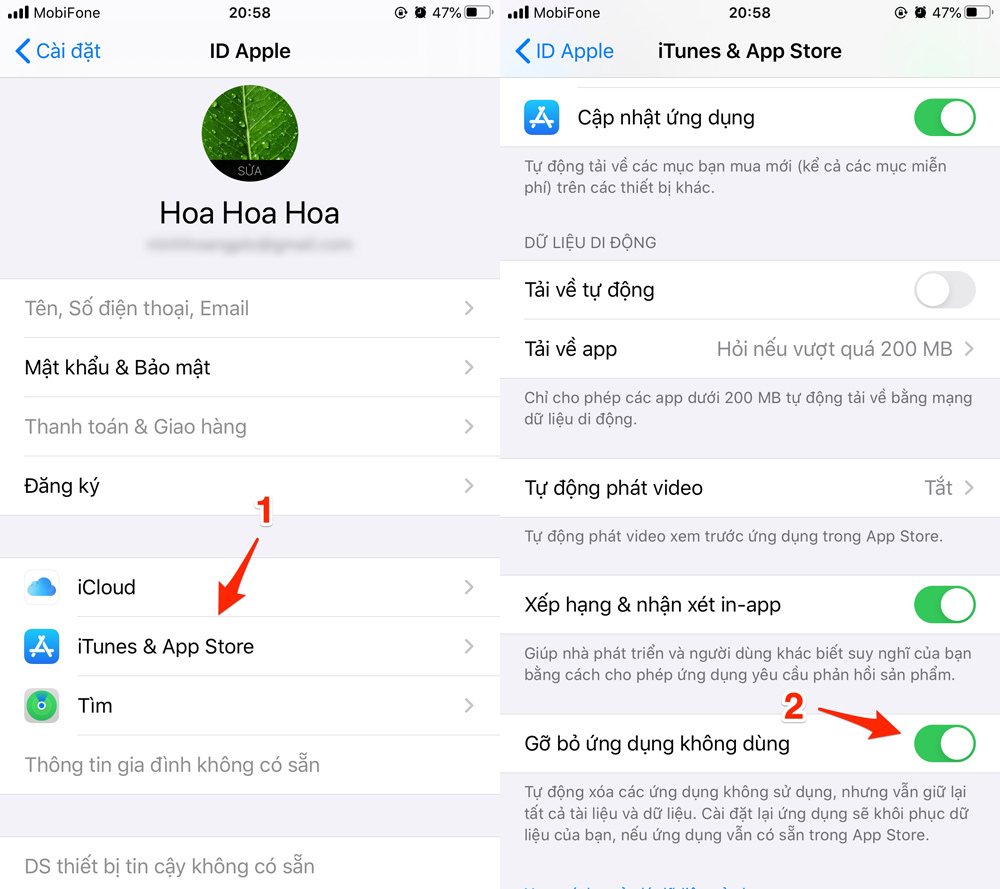 Đầu tiên, bạn truy cập vào phần Settings (cài đặt) - Tên tài khoản - iTunes & App Store và kích hoạt tùy chọn Offload Unused Apps (gỡ bỏ ứng dụng không dùng). Về cơ bản, iPhone sẽ tự động gỡ bỏ các ứng dụng không được sử dụng trong một thời gian dài nhưng vẫn giữ lại toàn bộ dữ liệu.