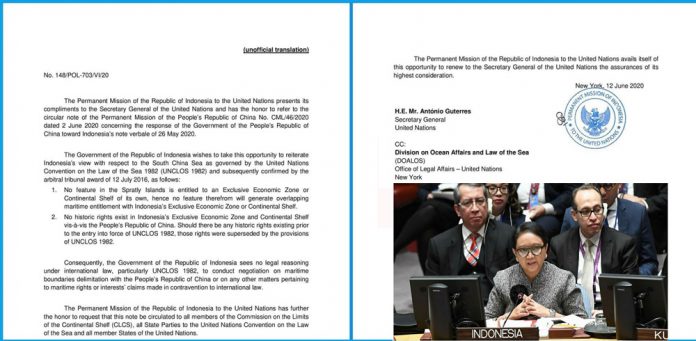 Sau công thư ngày 1/6/2020 của Hoa Kỳ, ngày 12/6/2020 Chính phủ Indonesia đã gửi lên Liên hiệp quốc một công hàm trả lời công hàm CML/46/2020 ngày 2/6/2020 của Trung Quốc. Công hàm của Chính phủ Indonesia đã cứng rắn tuyên bố rằng Trung Quốc không có vùng đặc quyền kinh tế, thềm lục địa hay bất cứ quyền lịch sử nào tại quần đảo Trường Sa. Do vậy Indonesia không đàm phán với Trung quốc về lãnh hải hay bất cứ vấn đề gì liên quan đến đòi hỏi của Trung Quốc ở quần đảo Trường Sa.