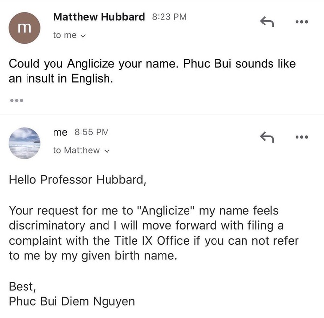 Sinh viên Phuc Bui Diem Nguyen gửi email trả lời sau 30 phút: “Việc thầy yêu cầu ‘chuyển tên thành tiếng Anh’ làm tôi cảm thấy bị phân biệt đối xử, và tôi sẽ nộp đơn kiến nghị với Văn phòng Title IX nếu thầy không gọi tôi bằng tên thật của mình”.