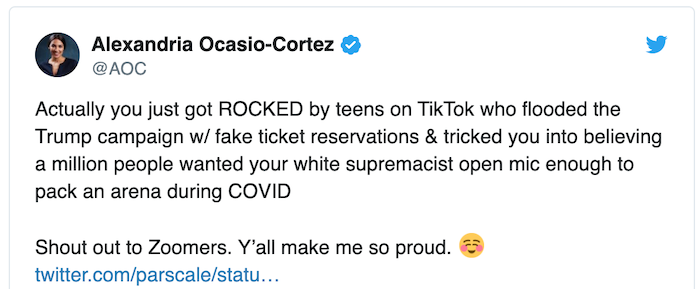 Bà Ocasio-Cortez, dân biểu New York của đảng dân chủ hả hê viết lời nhắn công khai tới chiến dịch Trump qua Twitter: “Thực ra các ông đă bị làm chao đảo bởi đám thanh niên trên TikTok, những người đă làm ngập ngụa chiến dịch tranh cử của Trump bằng việc đặt vé giả và lừa các ông tin rằng một triệu người muốn nghe đồ da trắng thượng đẳng của các ông mở kịch trường giữa cơn dịch COVID. Hăy hét lên với các Zoomers: Các bạn làm tôi rất tự hào!”.Bà Ocasio-Cortez đề cập đến từ Zoomers, c̣n gọi là “thế hệ Z”, một thuật ngữ ám chỉ những người sinh từ nửa cuối thập niên 1990 tới những năm đầu thập niên 2010. TikTok là một mạng xă hội thuộc sở hữu của công ty Trung Quốc ByteDance, bị nghi ngờ kiểm duyệt thông tin và hỗ trợ truyền bá luận điệu của Đảng Cộng sản Trung Quốc.