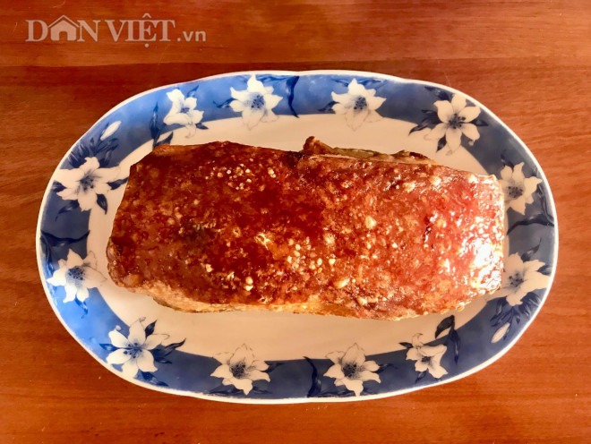 - Lật miếng thịt phía mặt bì, lấy giấy ăn thấm khô hết bề mặt. Quét lên đó một lớp dấm gạo rồi tiếp một lớp muối rất mỏng.