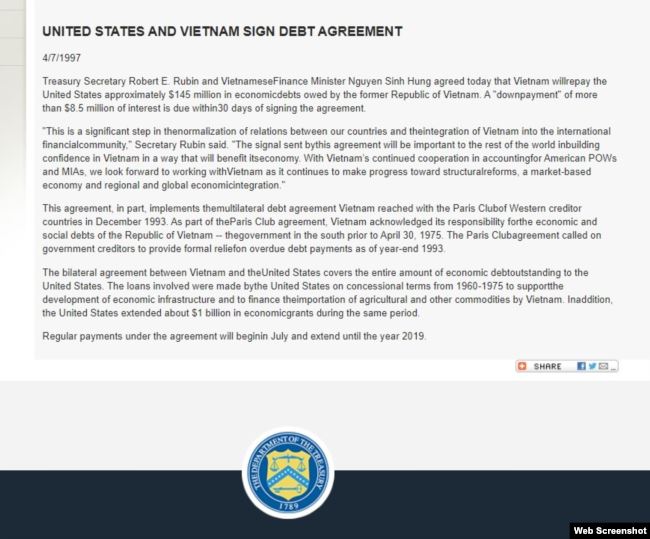 Trong một email gửi cho VOA Tiếng Việt gần đây, người phát ngôn Bộ Tài chính Hoa Kỳ cho biết: “Việt Nam đã hoàn tất các khoản thanh toán của mình. Kể từ ngày 31/12/2019, Việt Nam không còn nợ bất kỳ khoản nợ nào đối với bất kỳ cơ quan chủ nợ nào của chính phủ Hoa Kỳ.”