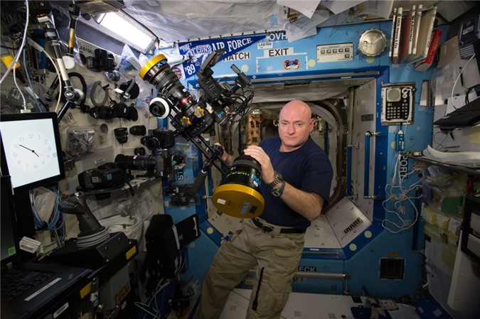 Chụp hình trong vũ trụ khó như thế nào? Và đây là câu trả lời. Ông Kelly đang cầm trên tay bộ thiết bị chụp ảnh chuyên dụng được sử dụng để chụp ảnh trên trạm không gian.