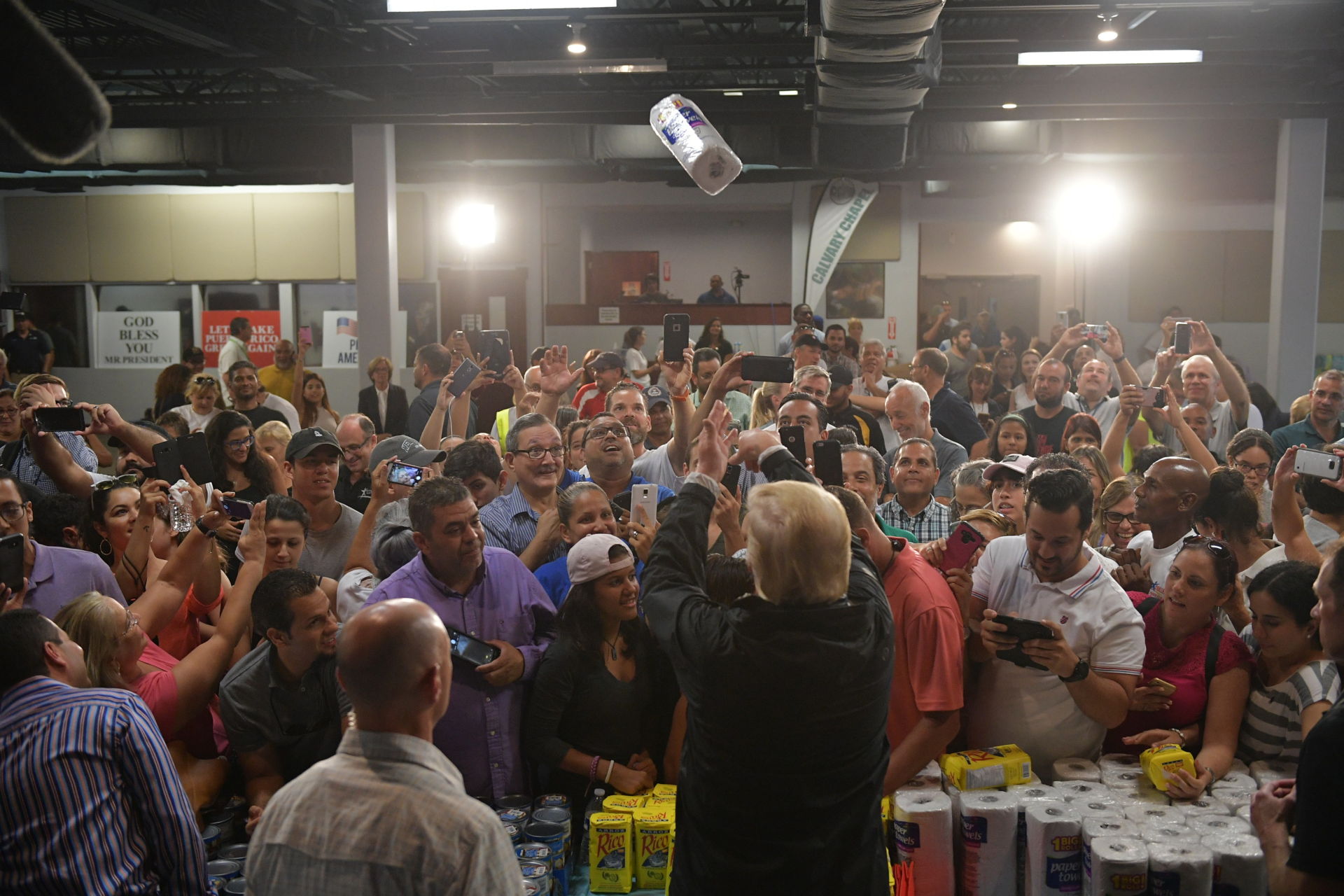 Tổng Thống Donald Trump ném cuộn giấy cho đám đông tại một điểm cứu trợ. (Hình: Mandel Ngan/AFP/Getty Images)