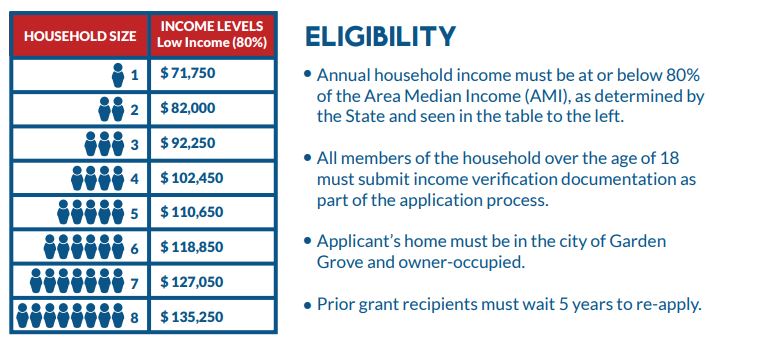 Để được nhận trợ cấp sửa nhà từ Garden Grove, thu nhập mỗi năm của gia đình chủ nhà phải bằng hoặc dưới 80% thu nhập trung vị của khu vực (Area Median Income) do tiểu bang California xác định.
