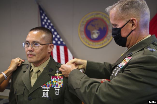 Thiếu tướng Carl Mundy, Tư lệnh USMARCENT, gắn quân hàm cho tân Thiếu tướng gốc Việt William Seely, ngày 31-07-2020. Photo Twitter USMARCENT.