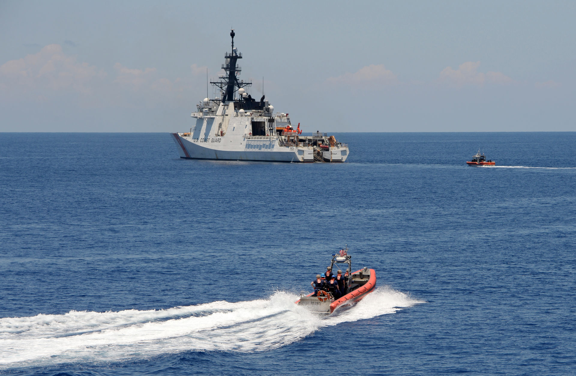 Tàu Tuần Duyên Mỹ USCGC Bertholf tập luyện với hai tàu Cảnh Sát Biển Philippines tại khu vực gần bãi cạn Scarborough mà Philippines tuyên bố chủ quyền trên Biển Đông hồi Tháng Năm, 2019. (Hình: Ted Aljibe/AFP via Getty Images)