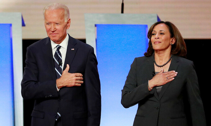 Joe Biden và Kamala D. Harris tại cuộc tranh luận của đảng Dân chủ ở Michigan tháng 7/2019. Ảnh: Reuters.