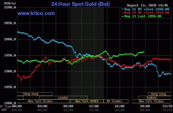 Chốt phiên 13/8, mỗi ounce vàng giao ngay thế giới tăng 39 USD lên 1.953 USD. Sáng nay, giá tiếp tục đi lên, hiện chạm 1.959 USD. Giá vàng tương lai cũng tăng 1,1% lên 1.970 USD.