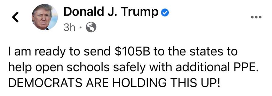 được học ở trường. Thay vào đó, họ muốn chúng tôi và con cái chúng tôi ngu ngốc và bị trói trong chính ngôi nhà của chúng tôi để chúng kiểm soát chúng tôi. Họ không muốn chúng tôi phát triển và độc lập. Thay vào đó, họ muốn trói buộc chúng tôi và bị xích họ bằng cách phá hủy nền kinh tế của chúng tôi và khiến người dân không còn lựa chọn nào khác ngoài việc phụ thuộc vào họ. Những chiến thuật cộng sản này là nguy hiểm và không phải của Mỹ. Tuy nhiên, đảng Dân chủ lại nghĩ khác. Họ coi sự tấn công của vi rút Trung Quốc vào Đất nước chúng ta là cơ hội tuyệt vời để phục vụ lợi ích của họ bằng cách biến nước Mỹ thành Chủ nghĩa xã hội.