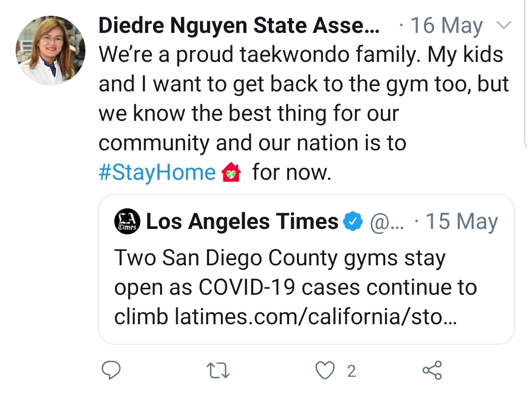Bà Diedre trả lời thông điệp đó hôm 16 Tháng Năm: “Chúng tôi tự hào là một gia đình taekwondo. Các con của tôi và tôi cũng muốn quay lại phòng tập thể dục, nhưng chúng tôi biết điều tốt nhất cho cộng đồng và quốc gia của chúng ta là #StayHome ngay lúc này. ”