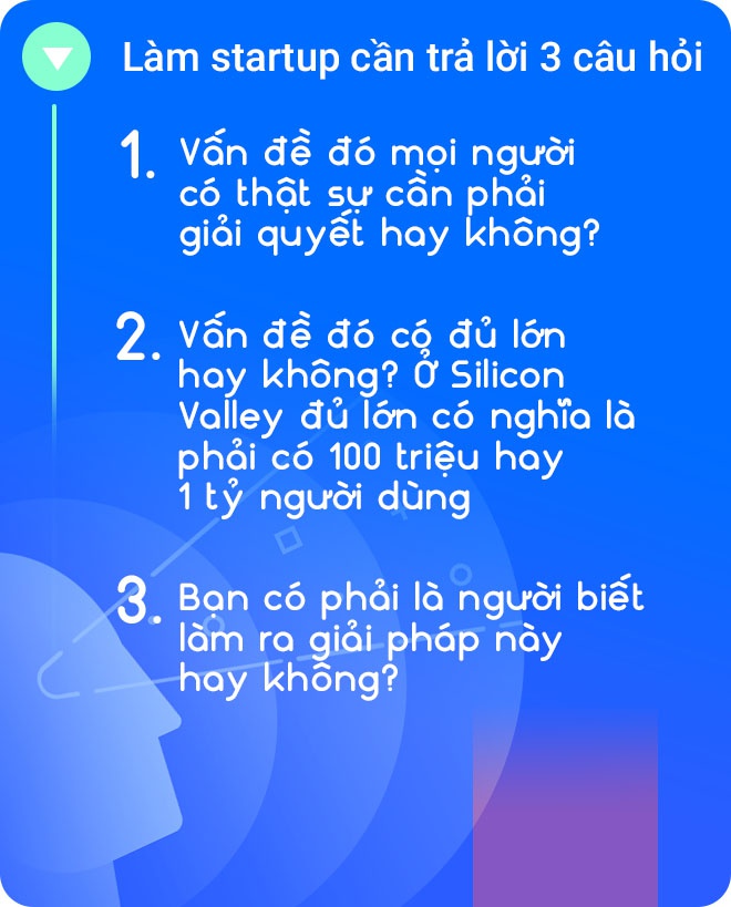 Theo tôi, khởi nghiệp trong lĩnh vực công nghệ phải tập trung vấn đề chứ đừng tập trung việc mình có giải pháp. Vì tập trung vào giải pháp sẽ quên mất nhu cầu có đủ lớn hay không.
