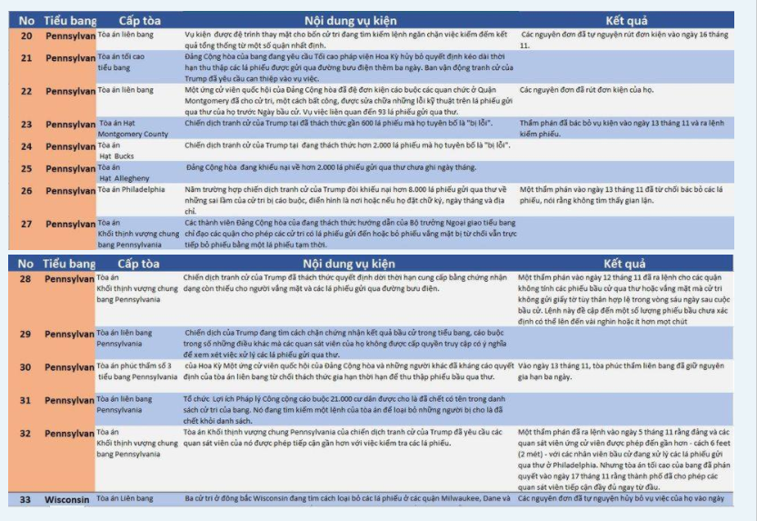 Tổng số các vụ kiện của đội Trump triển khai cả từ khâu chuẩn bị tới khâu sẵn sàng cho một mặt trận toàn diện hôm nay, là 33 vụ, rải trên 6 tiểu bang và rải đều từ cấp quận hạt, cấp tòa án liên bang cho tới Tối cao pháp viện. Trong đó chú trọng vào Pennsylvania ( 20 phiếu ) đã chuẩn bị từ rất sớm và sẵn sàng chờ tại Tối cao pháp viện. Nhưng chỉ riêng bang này thì không đủ phá kết quả, cần phải chờ cơ hội từ các bang khác với tình hình như sau: