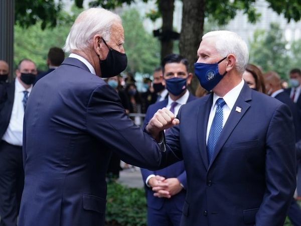 Phó Tổng Thống Mike Pence gặp và cụng tay chào cựu Phó Tổng Thống Joe Biden ở đài tưởng niệm 9-11 New York