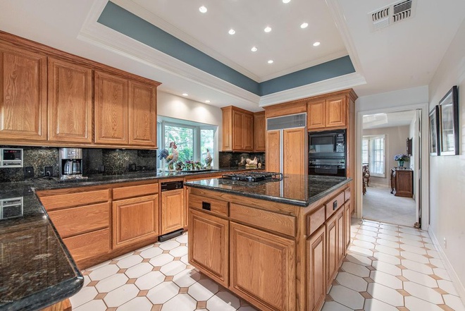 Nhà bếp rộng rãi và thoáng đãng. Không gian này nổi bật với tủ bếp và đảo được làm từ gỗ sồi.