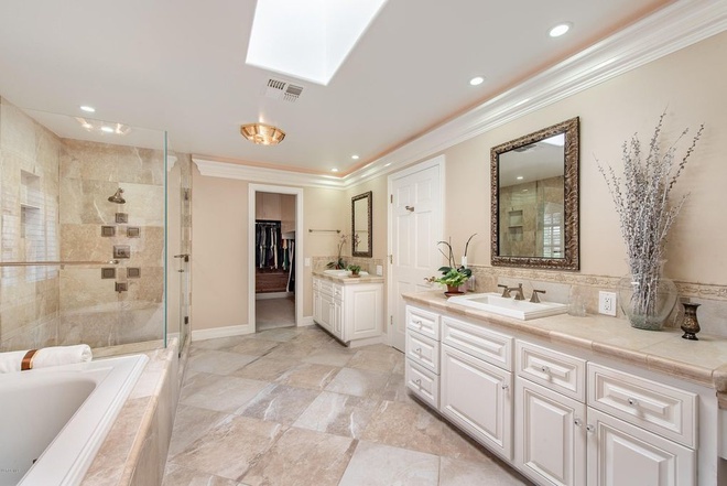 Phòng tắm chính thanh lịch, mang tông màu be chủ đạo, được chia thành nhiều khu vực khác nhau.
