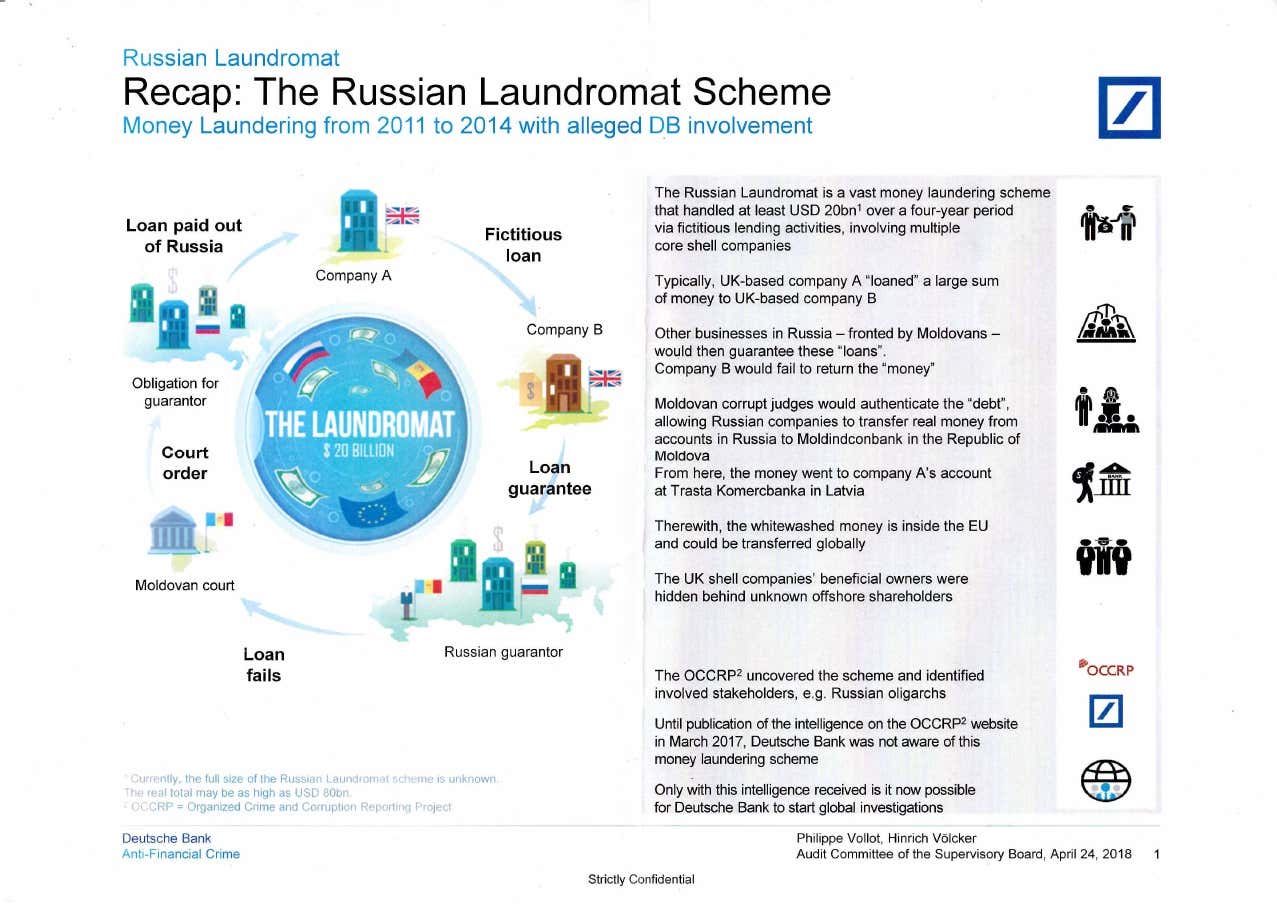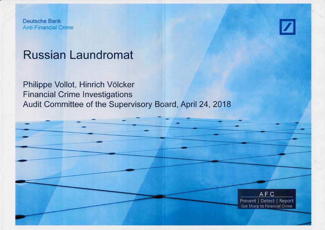 Deutsche Bank đă bị lôi kéo vào một hoạt động rửa tiền quy mô lớn, được mệnh danh là Tiệm giặt Toàn cầu. Tội phạm Nga có liên hệ với Điện Kremlin, KGB cũ và cơ quan kế thừa là FSB, đă sử dụng kế hoạch đó từ năm 2010 đến năm 2014 để chuyển tiền vào hệ thống tài chính phương Tây. Các thám tử tin rằng số tiền mặt liên quan có thể lên tới 80 tỷ đô la.