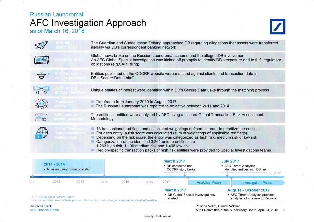 Ngay sau chuyện xấu hổ đó bị tiết lộ, ngân hàng đă yêu cầu hai nhà điều tra tội phạm tài chính nội bộ - Philippe Vollot và Hinrich Völcker - để t́m hiểu điều ǵ đă xảy ra. Bản tŕnh bày dài chín trang của họ đă được chia sẻ vào năm ngoái với ủy ban kiểm toán của ban giám sát ngân hàng và được đánh dấu là "tuyệt mật".