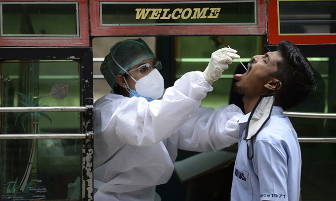 Nhân viên y tế lấy mẫu xét nghiệm Covid-19 bên ngoài trung tâm thương mại ở thành phố Chennai, Ấn Độ, ngày 12/9. Ảnh: AFP.